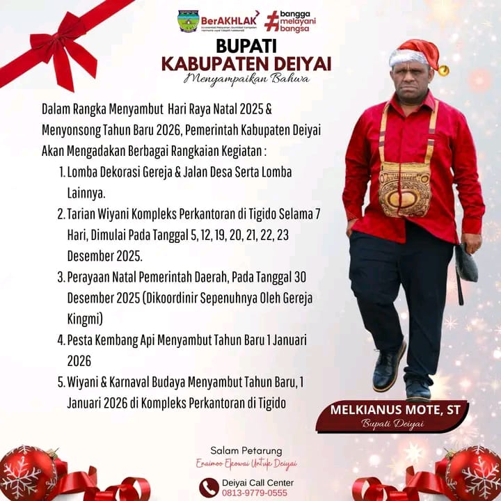 Deiyai [SINAR BEMO] — Menjelang Hari Raya Natal 2025, Bupati Kabupaten Deiyai, Melkianus Mote, menyiapkan serangkaian kegiatan untuk membangkitkan sukacita Natal di seluruh wilayah Deiyai. Berbagai agenda ini disusun untuk menghadirkan suasana perayaan yang lebih hidup, penuh kebersamaan, serta mendorong partisipasi masyarakat dari berbagai kampung dan gereja.