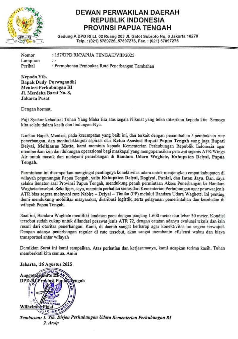 Anggota DPD RI asal Papua Tengah, Wilhelmus Pigai, secara resmi menyampaikan aspirasi tersebut kepada Menteri Perhubungan RI, Dudy Purwagandhi. Surat dengan Nomor: 157/DPD RI/PAPUA TENGAH/VIII/2025 yang dikirim pada 26 Agustus 2025 itu berisi permohonan pembukaan rute penerbangan tambahan yang melayani Bandara Waghete, Kabupaten Deiyai.