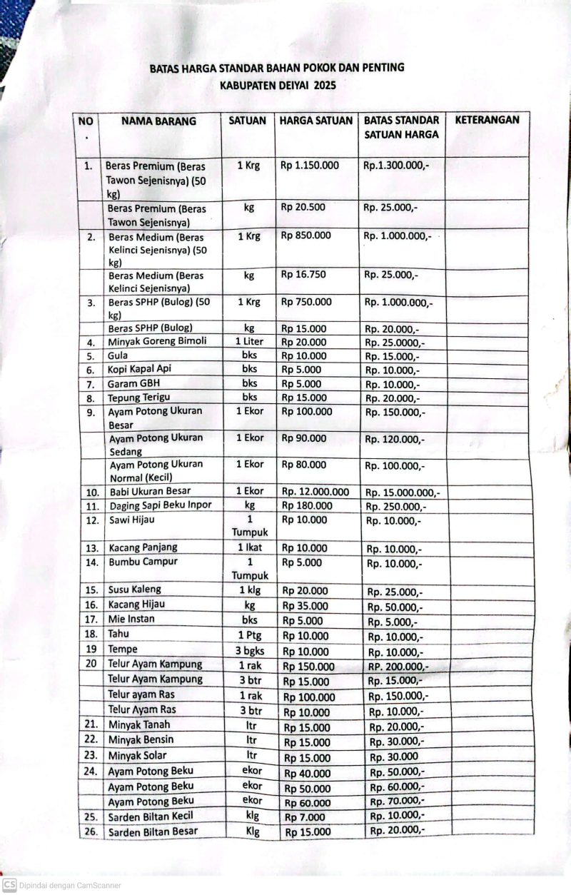 Daftar Harga Bahan Pokok dan BBM yang Ditetapkan Pemerintah Kabupaten Deiyai